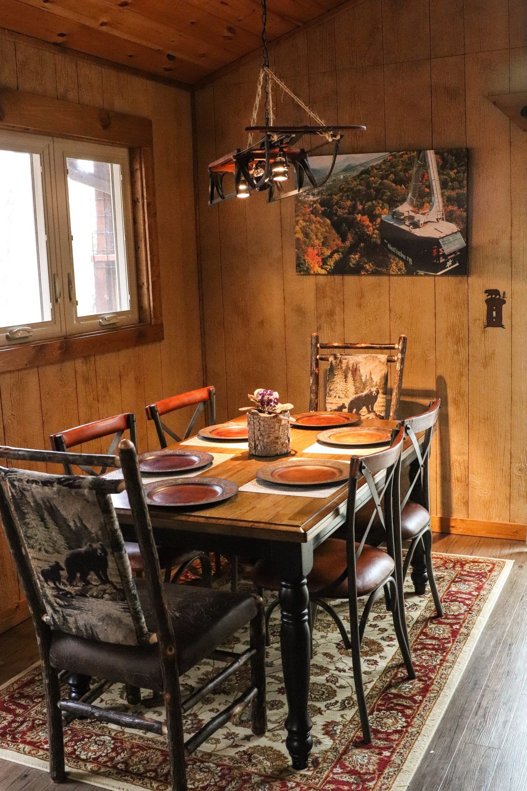 Step in from your day’s adventure to the warm glow of the living room. Its vaulted ceilings and soft lighting provide the space and atmosphere to unwind. If adventure around the cabin is more your speed, you won’t want to forget a family movie on the large, flatscreen TV. Connect to Wi-Fi, bring your DVDs, or choose something from cable TV as you gather around the electric fireplace. Two plush couches and two mountain-crafted rocking chairs provide comfortable seating for all of your family. And you can easily pop some popcorn or grab your favorite drinks from the refrigerator in the nearby kitchen for a fun movie night in the cabin. You’ll spend quality time chatting, relaxing, and enjoying the serenity of the Smoky Mountains in this charming and welcoming living room after a long day.
