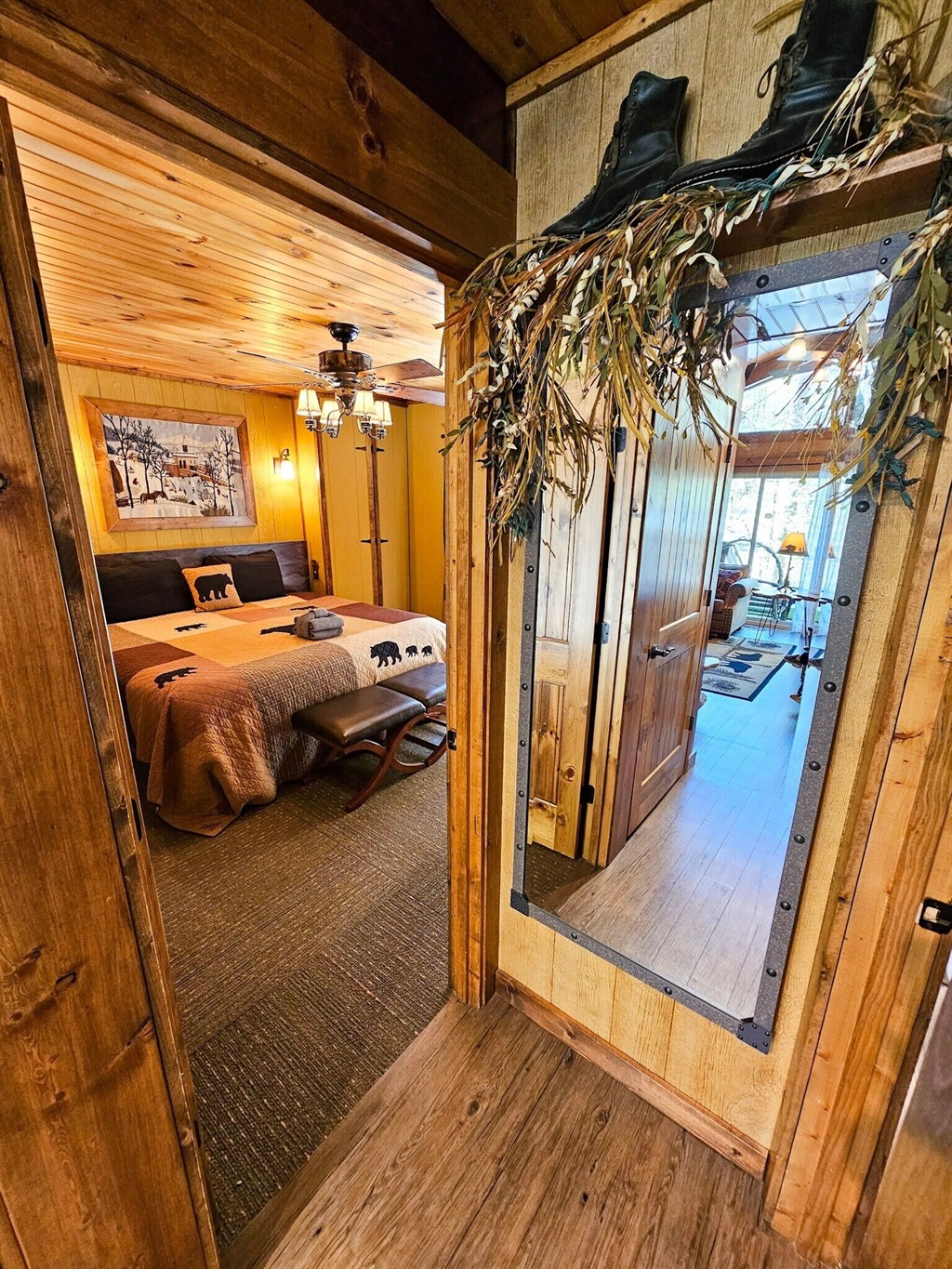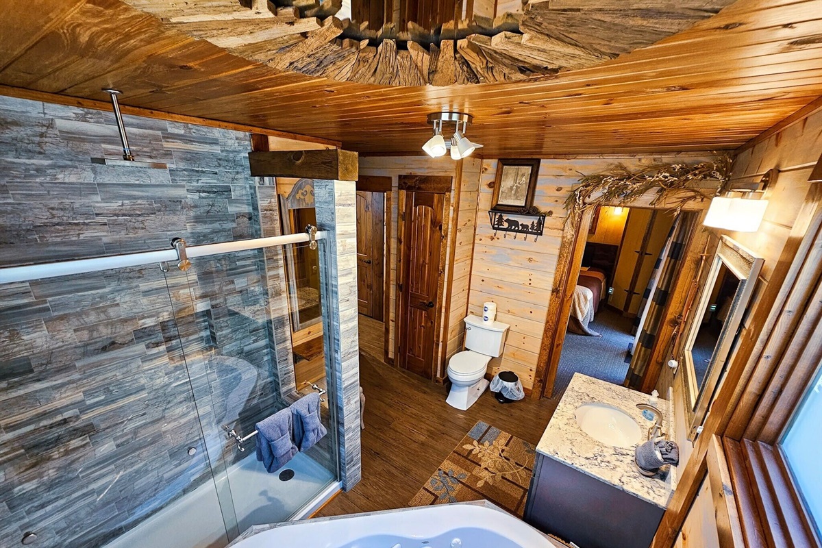Whether you retreat to the bedroom to unwind from your adventure or enjoy your adventure until every last drop of fun has been drained, Double Creek has what you need. Two king-sized beds and one sleeper sofa in the living room provide sleeping space for up to 6 people. If down time is part of your nightly ritual, consider the downstairs bedroom. Its en-suite bath contains a jetted tub, perfect for soaking adventure-sore muscles. Or you might prefer the custom walk-in shower with beautiful mountain scenery etched on the glass door. The upstairs room, also king-sized, has its own en-suite bath. From the comfort of the small adjoining private balcony, start and end your day with beautiful views of the creek or the stars in the mountain skies. All sleeping spaces provide access to flatscreen TVs so that you can watch until you are ready to drift off to sleep.